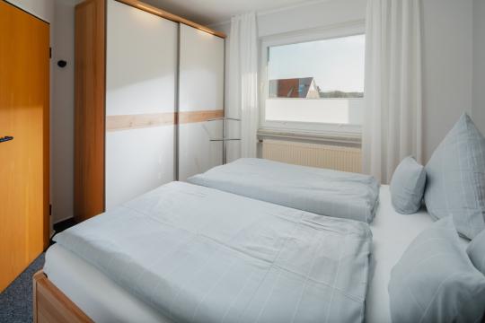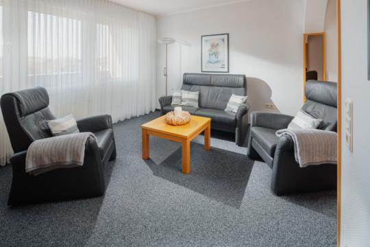 Hier finden Sie alles für einen erholsamen Urlaub zu zweit: ein Schlafzimmer mit einem großen Doppelbett, ein geräumiges Wohnzimmer sowie einen möblierten Balkon nach Süd-/Westen; eine komplett ausgestattete, große Wohnküche mit Essplatz und einen möblierten Südbalkon sowie ein helles Tageslichtbad mit Fußbodenheizung, Dusche, WC, Radio uns Föhn.