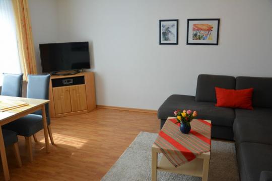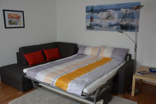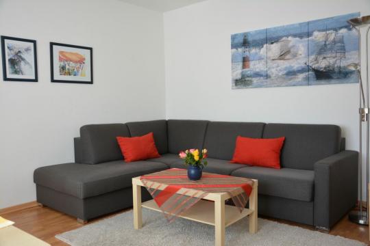 - 1 Schlafzimmer, 1 Wohn-Schlafraum mit Schlafsofa (1,60 x 2,00 m), Küchenzeile (Ceranfeld, Backofen), Kabel-TV (40" HD Fernseher), Radio, CD Player, WLAN, Dusche/WC, Flur mit Garderobe